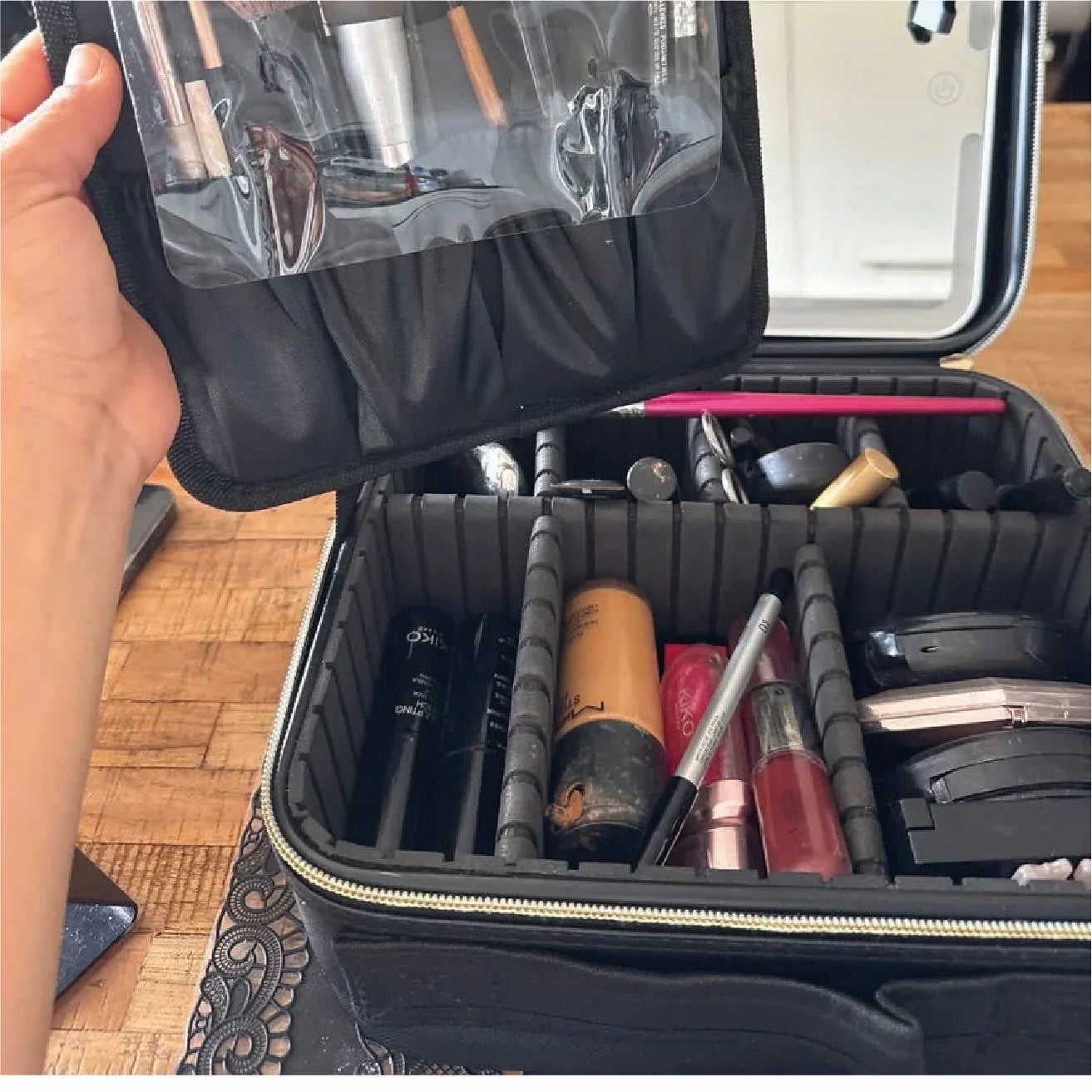 Sí, cuenta con espacio organizado para brochas y maquillaje.
